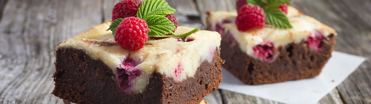 Den Brownie-Teig in eine gefettete und bemehlte Auflaufform geben, dann die Hälfte der Himbeeren unter den Teig ziehen. Die zweite Hälfte der Himbeeren darauf verteilen und die Cheesecake-Masse darübergießen. Evtl. alles mit einer Gabel durchziehen.