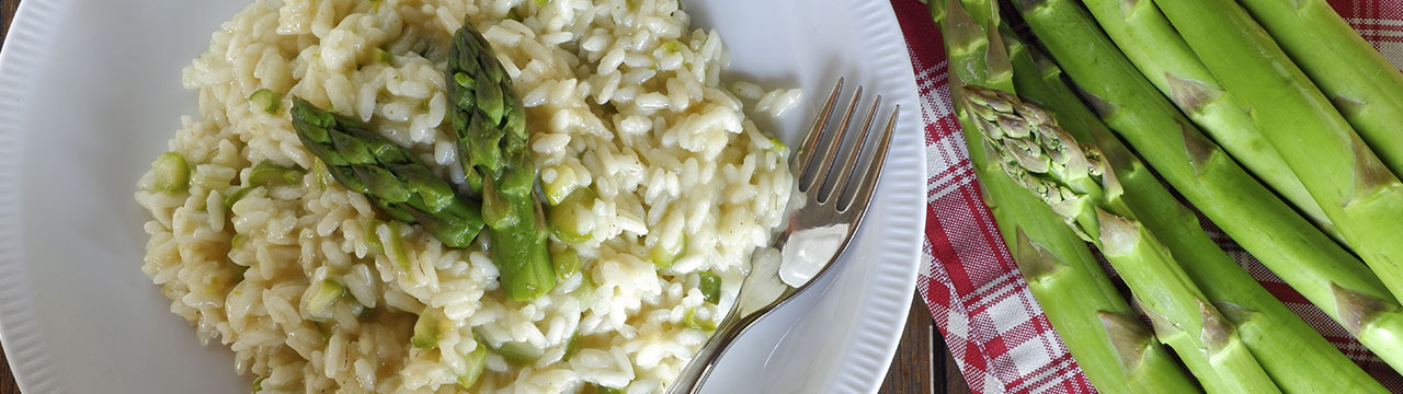 Die Zwiebel fein hacken und mit Olivenöl in einem ausreichend großen Topf andünsten. Den Reis dazugeben und ihn rühren, bis er glänzt. Jeweils die Hälfte von der Zitronenschale und dem Zitronensaft dazugeben. Dann erstmals einen Teil des Spargelwassers und des Fonds dazu gießen. Bei geringer Hitze ständig rühren, bis die Flüssigkeit vom Reis aufgenommen ist. Im Anschluss den Rest der Flüssigkeit dazu gießen, bis der Reis weich und cremig gegart ist. Dieser Vorgang dauert etwa 30 bis 40 Minuten.