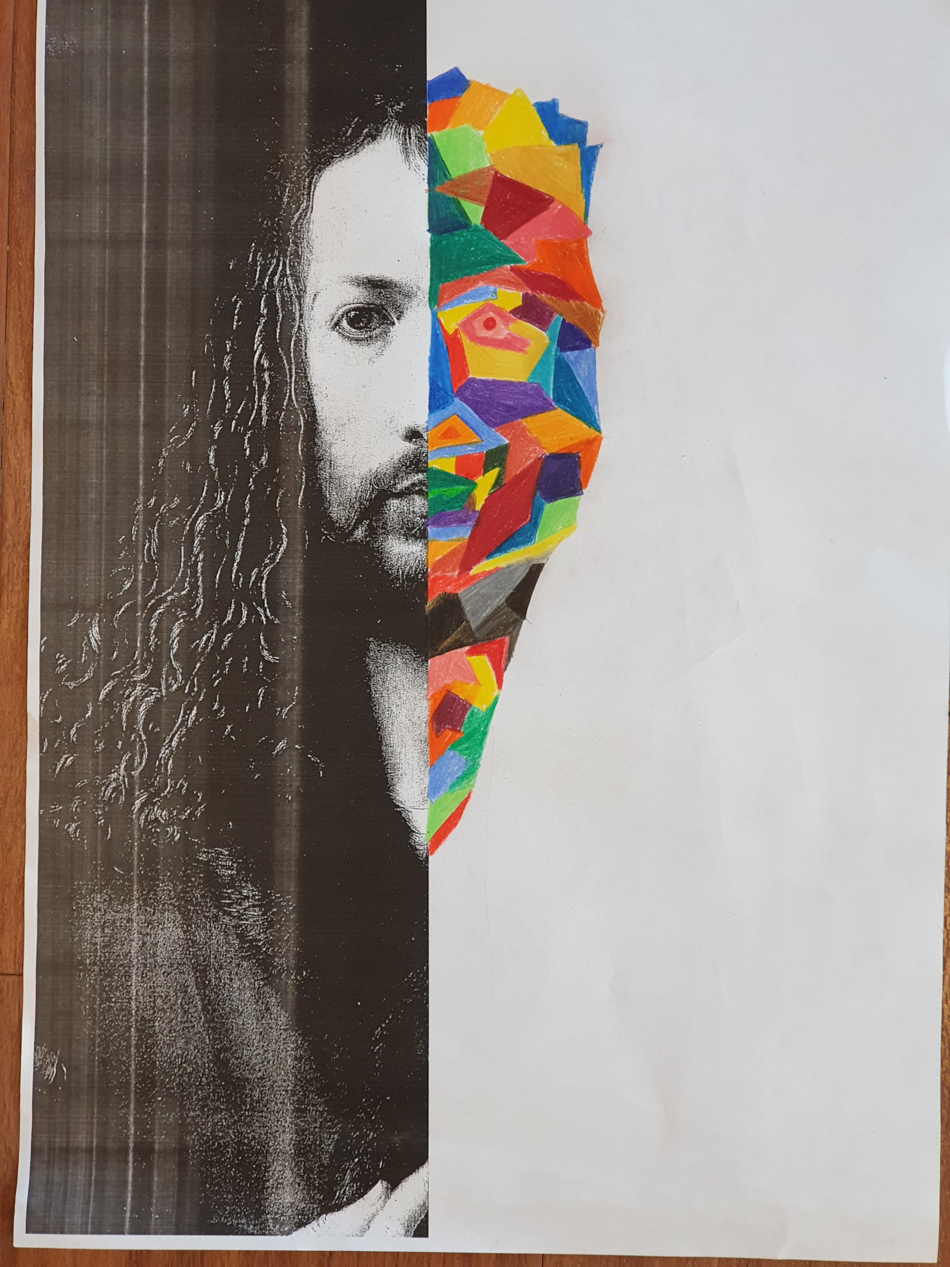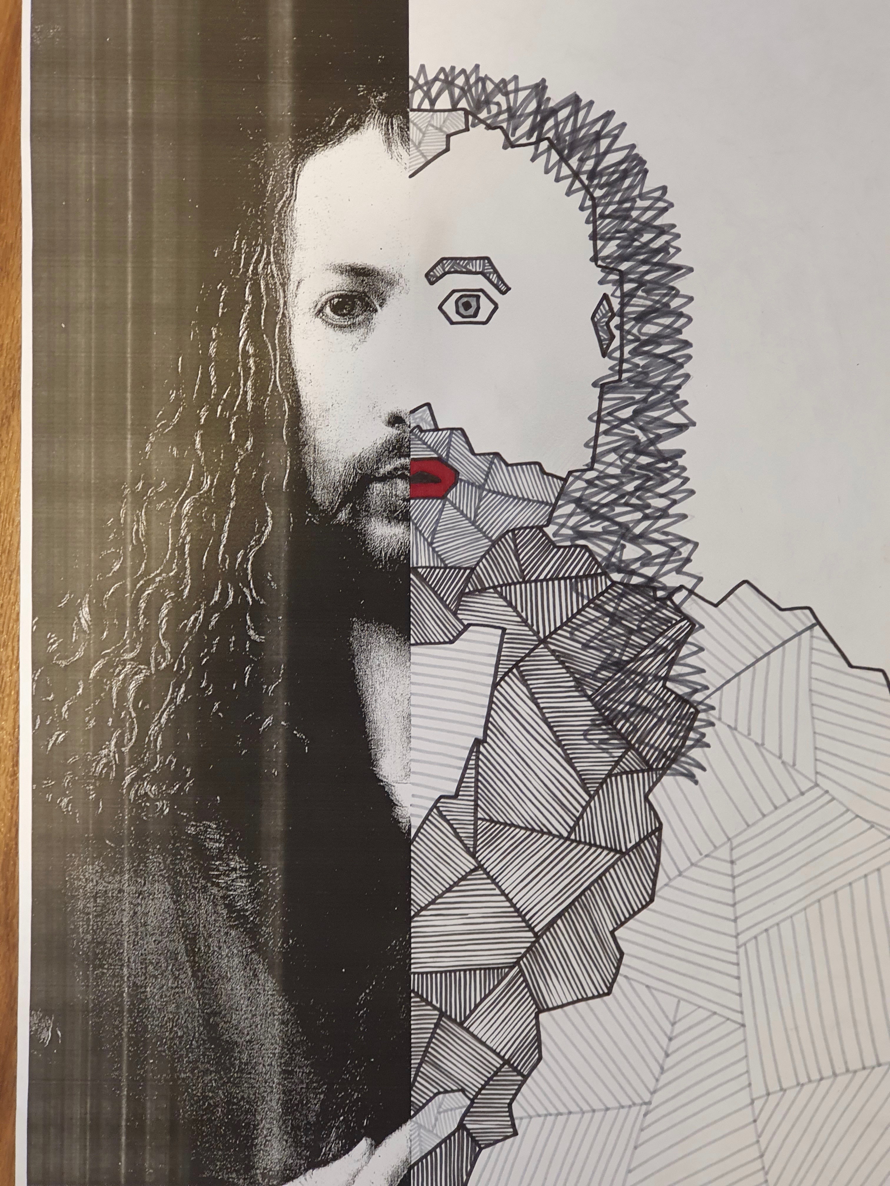 Ausgangspunkt meines Kunstworkshops war eine zerschnittene Kopie des berühmten Selbstporträts von Albrecht Dürer aus der Alten Pinakothek. Die rechte Hälfte des Gesichtes war leer und die Patientinnen sollten diese Leerstelle ergänzen.