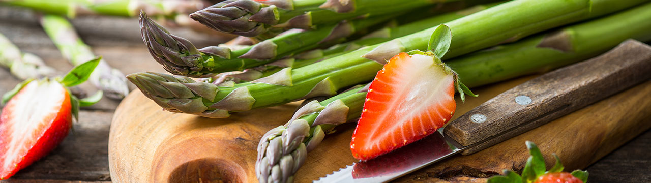 Den grünen Spargel waschen, die unteren Enden abbrechen und die Stangen in mundgerechte Stücke schneiden.