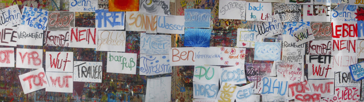Worte auf DIN A3 Blätter gekritzelt, gezeichnet, gemalt, geschrieben, mal mehr, mal weniger lesbar, werden an die Wand geklebt, die sich im Laufe der Zeit in eine Graffitiwand – oder vielleicht auch eine Klagemauer? – verwandelt.