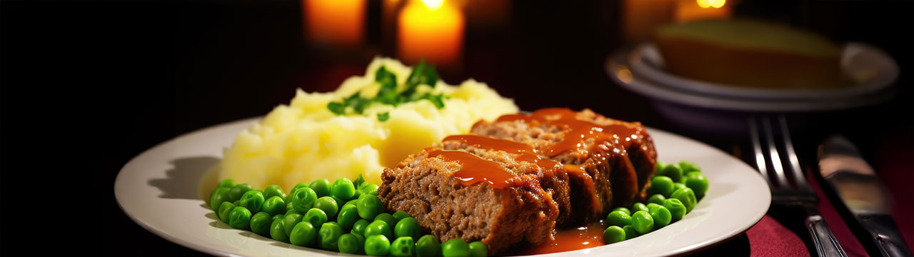 Den fertigen Hackbraten in Stücke (120g-150g) schneiden und mit dem Kartoffelbrei und den Rahmerbsen anrichten.