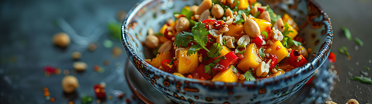 Es ist bereits Juni, aber der Sommer zeigt sich bislang noch nicht von seiner besten Seite. Da zaubern wir uns den Sommer doch ganz einfach mit einem erfrischenden Thai-Mango-Salat auf den Teller! Frische Limetten, knackige Paprika und süße Mangos mehr braucht es fast nicht für ein sonniges Geschmackserlebnis. Die würzige Note der Sojasauce und die knusprigen Erdnüsse sorgen für den perfekten Crunch. Probiert dieses leichte und aromatische Rezept als Beilage zum Grillen oder als erfrischenden Snack für zwischendurch. Und mit jedem Bissen holt Ihr Euch den Geschmack Thailands direkt nach Hause! ∗