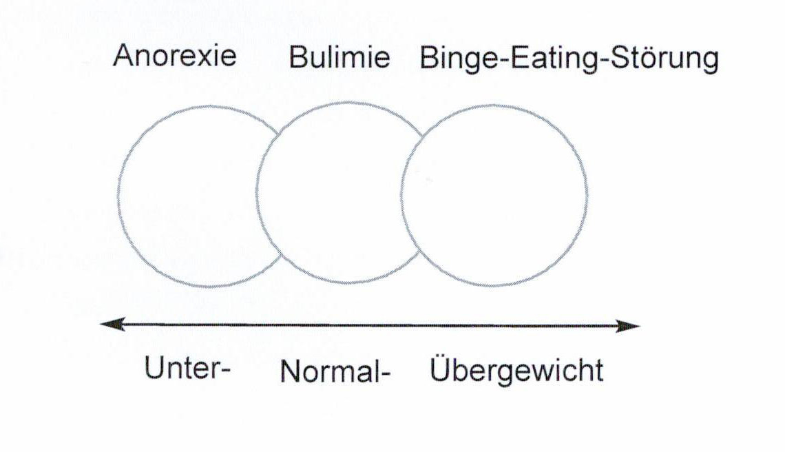 Die folgende Skala zeigt den Zusammenhang zwischen den drei definierten Störungsbildern Anorexie, Bulimie und Binge-Eating-Störung: